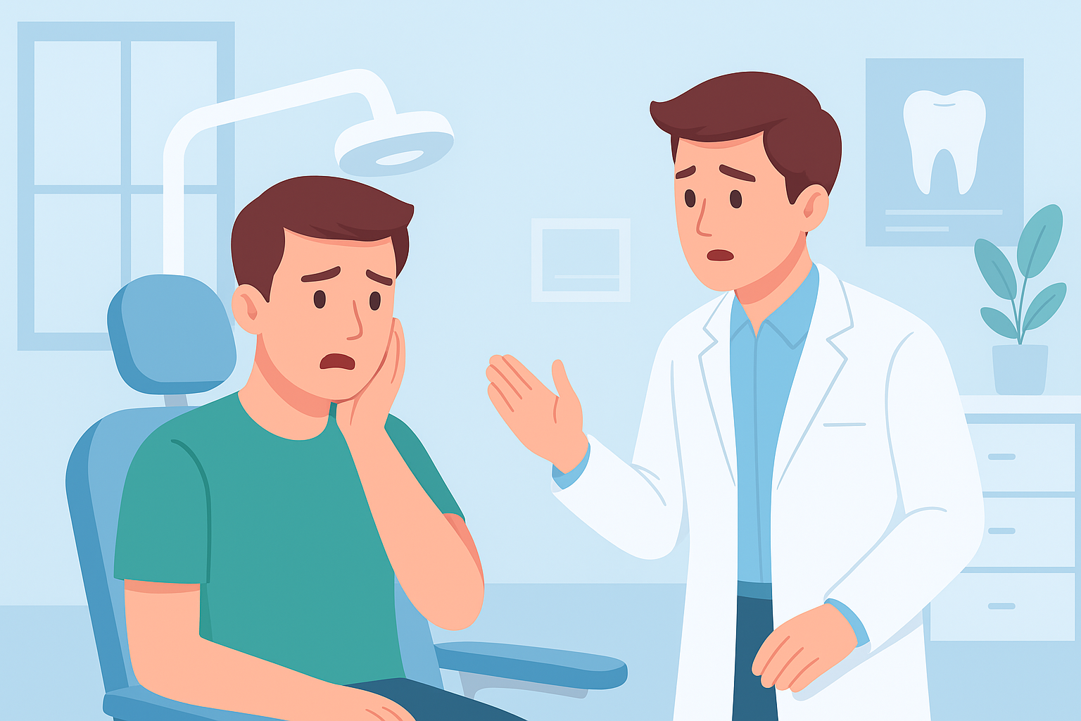Baru deh panik cari dokter gigi — dengan ekspresi antara bingung dan menyesal.